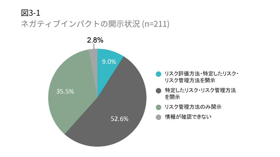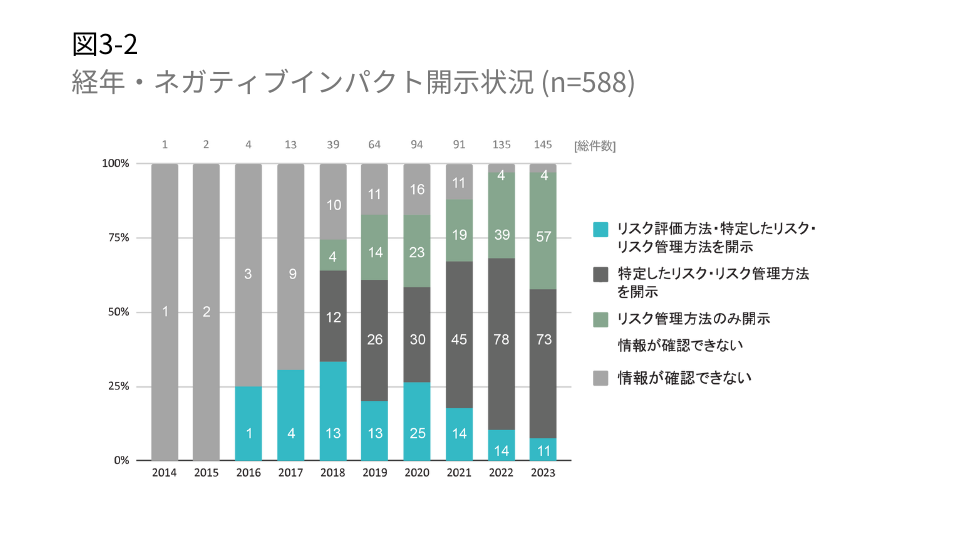 経年データをみると、ネガティブインパクトの開示状況において、リスク評価方法の開示は進んでいない。また、個別のプロジェクト・資産についての(立地や周辺環境、規模等に基づく)リスクに言及するケースは少なく、一般的な内容に留まるケースが多い。