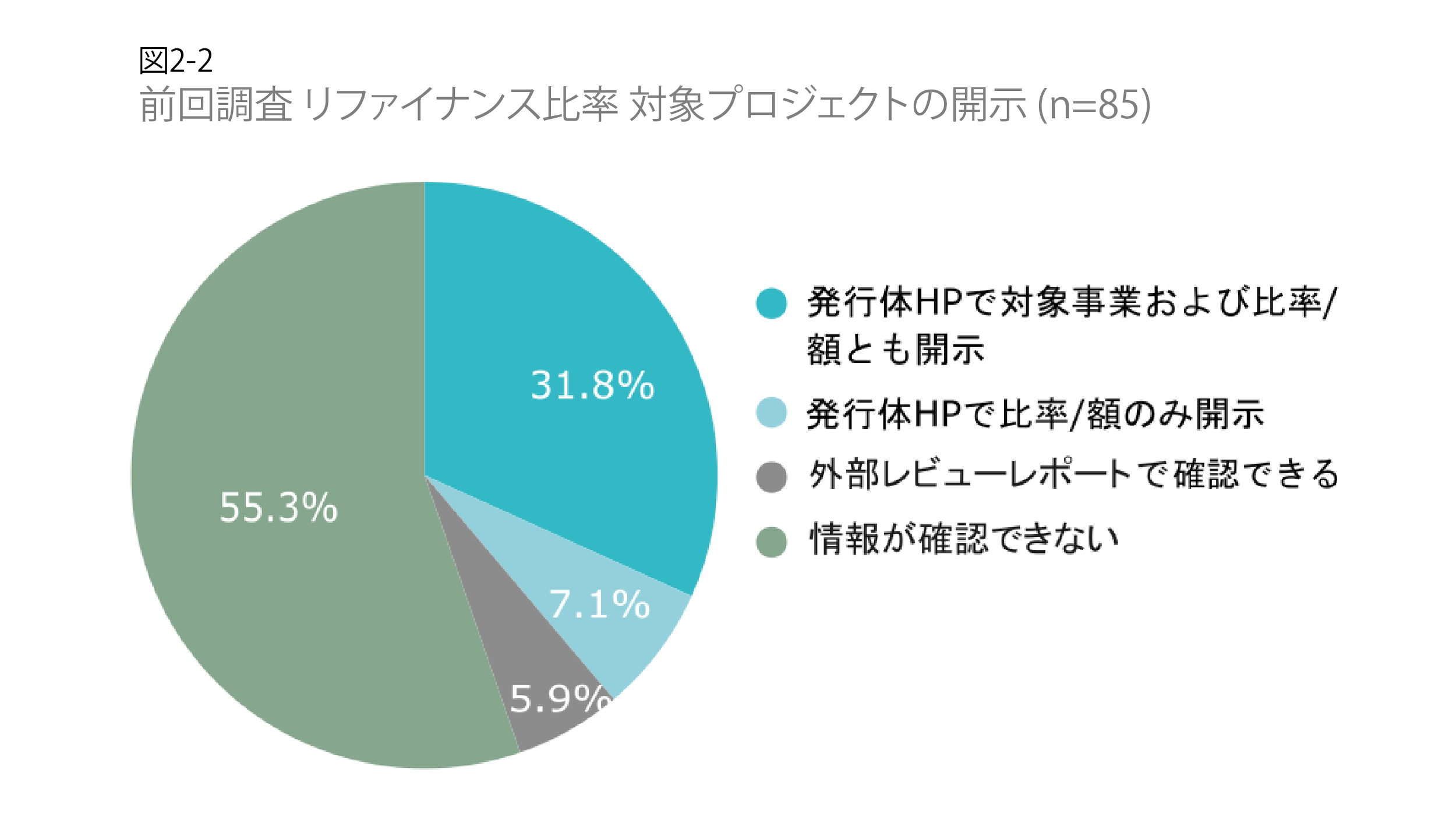 発行体ホームページでリファイナンス対象事業およびリファイナンス比率(又は金額)ともに開示があった銘柄は18.5%に留まる。基本的に発行体自身による開示が推奨されるが、外部レビューレポートでの開示(1.3%)を合わせても2割に満たない。