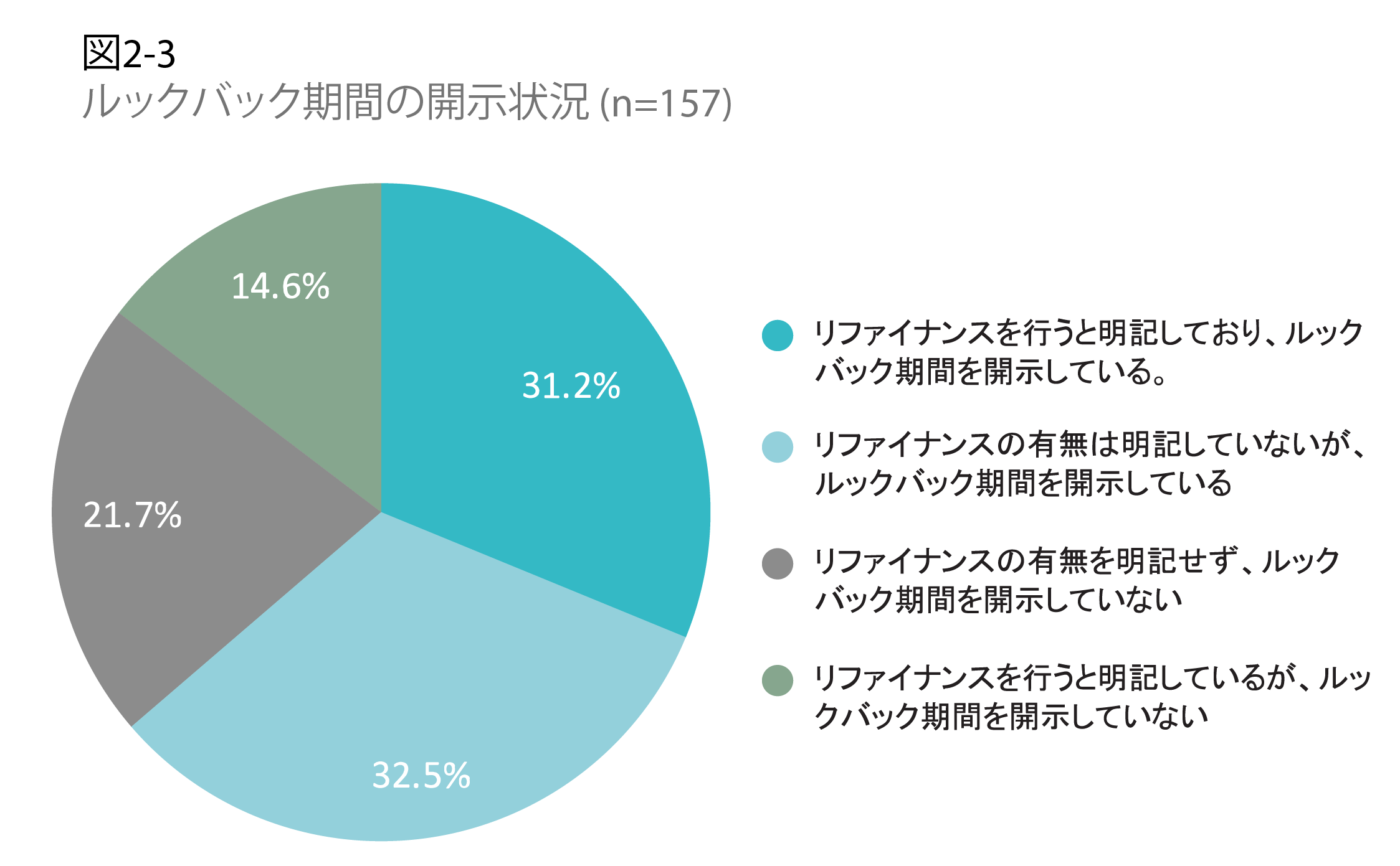調査対象211銘柄中、全額新規投資の54銘柄を除く157銘柄を対象に、発行時にリファイナンスの対象事業およびリファイナンス比率 (又は金額)、ルックバック期間を開示しているかを調査した。