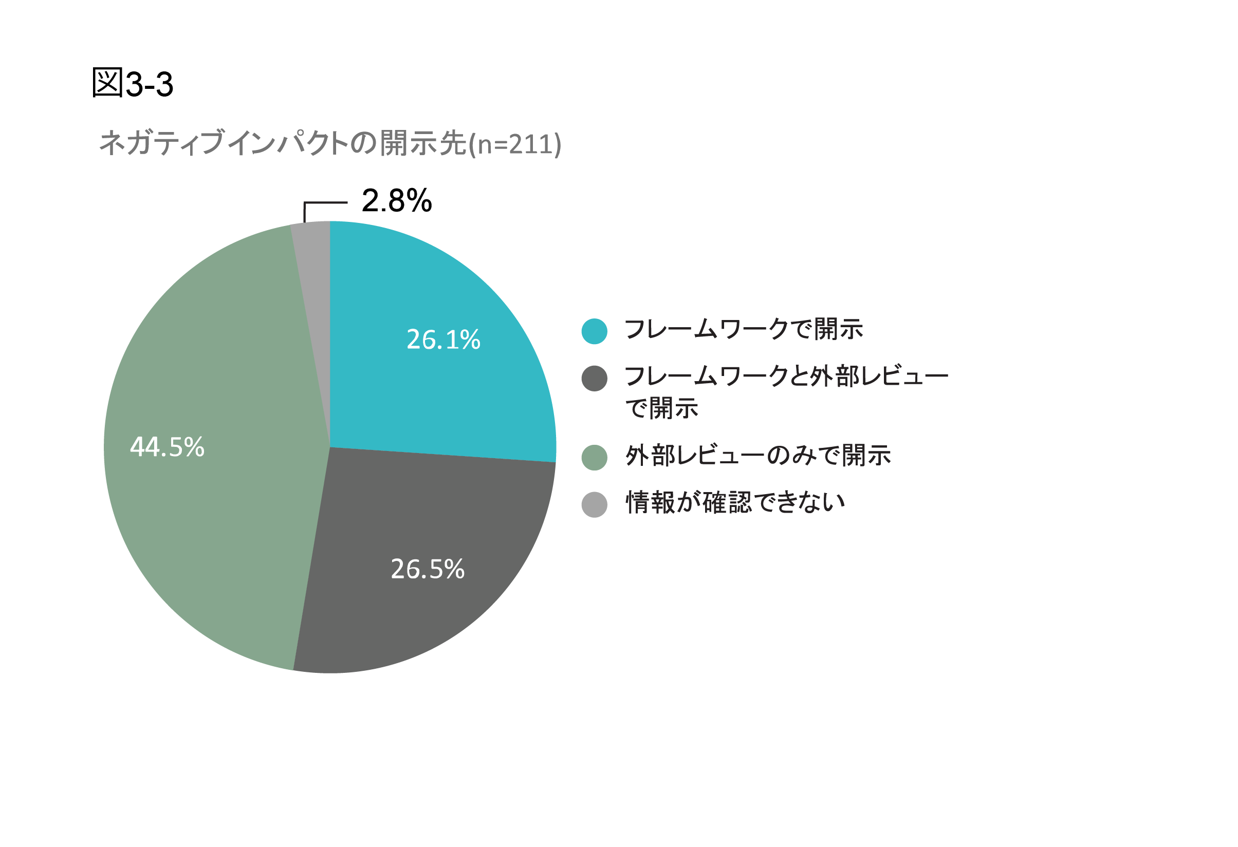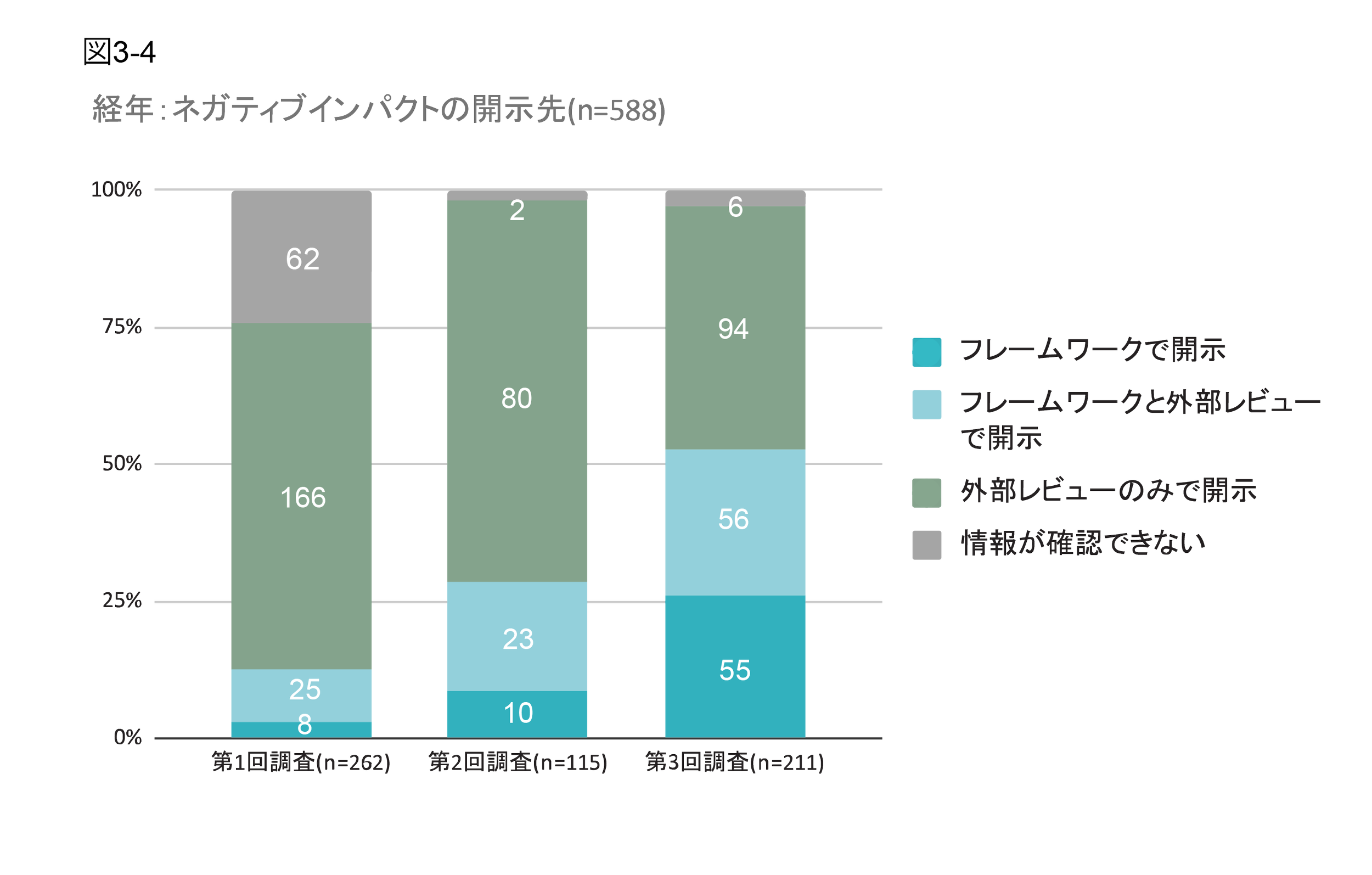 ネガティブインパクトの開示先について、フレームワークでの開示は第1回調査から3.1%→8.8%→26.1%と今回調査で大きく増加したが、「外部レビューのみでの開示」は63.4%→69.6%→44.5%と、前回調査よりは減少したものの半数近くを占める。
