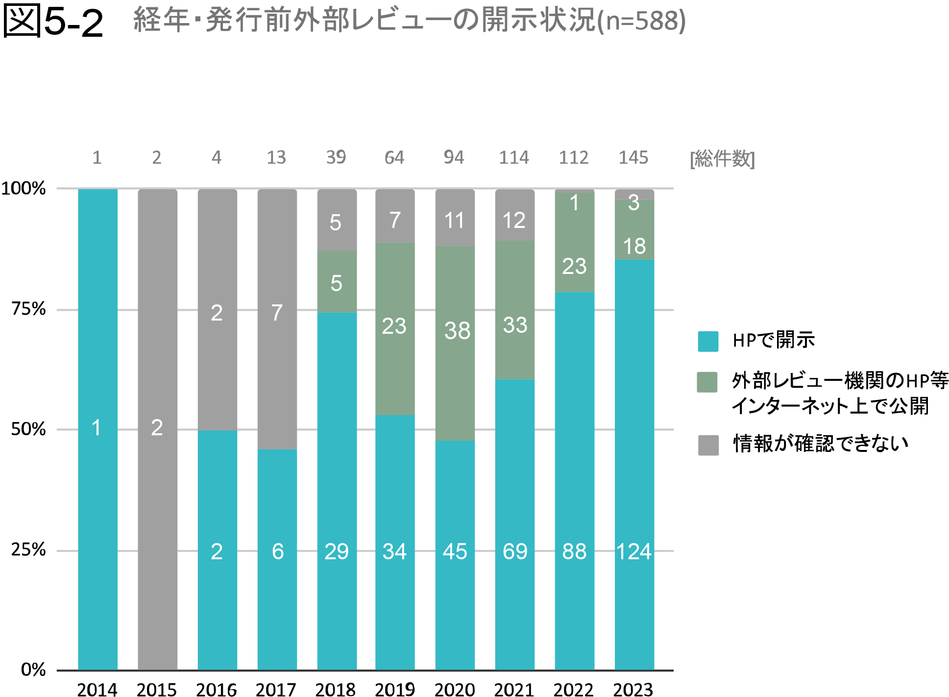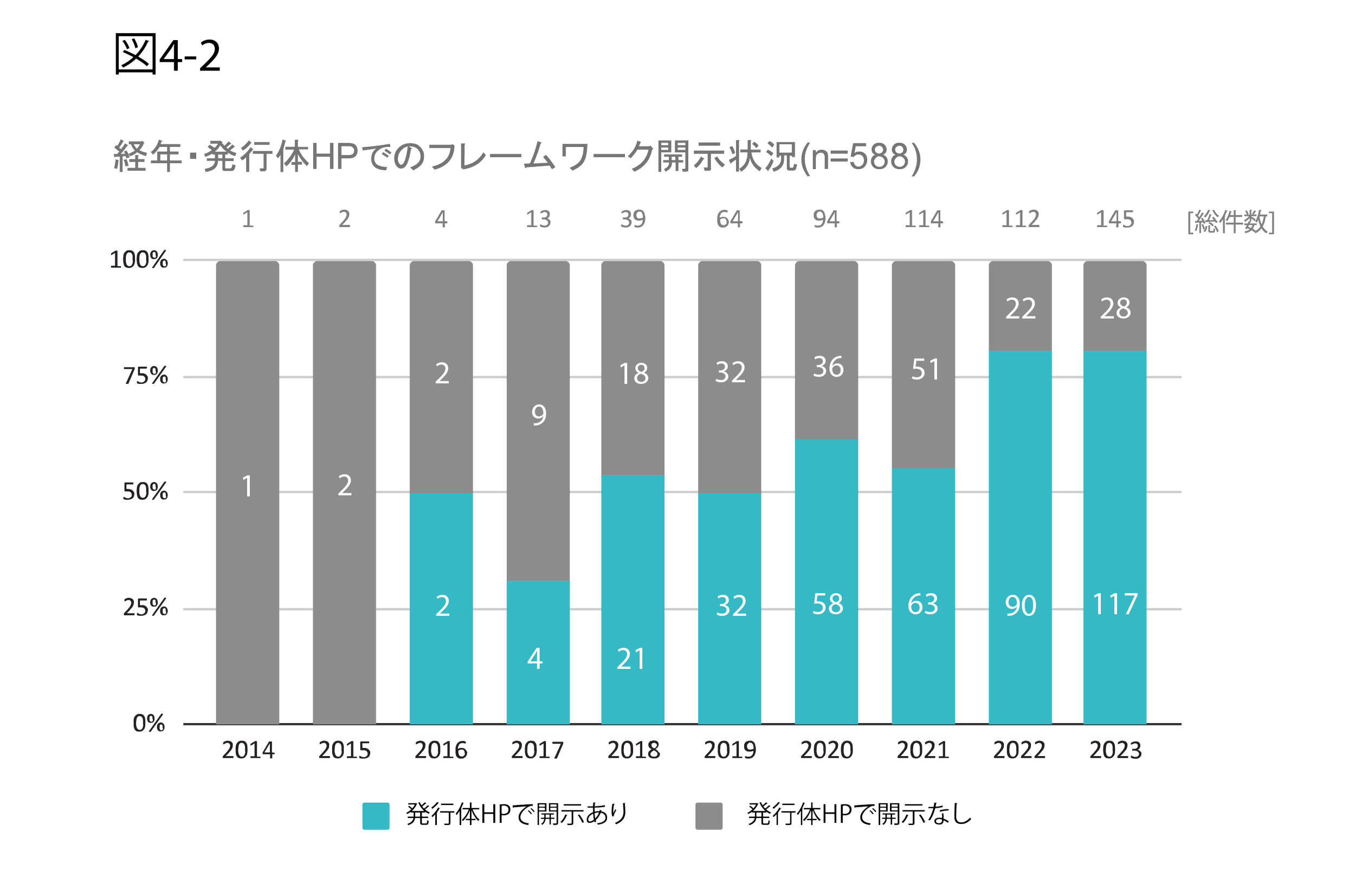 依然18%の発行体がホームページ上でフレームワークを開示していないが、経年データでみると、発行体HPでのフレームワークの開示は進んでいるといえる。