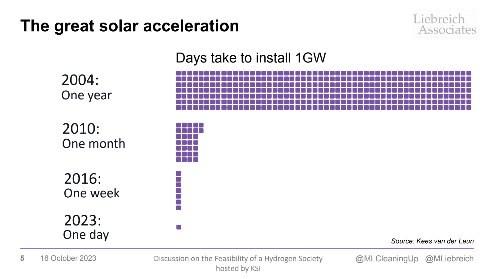 太陽光発電を例にとると、その成長ペースがよくわかります。2004年には、1GWの太陽光発電を設置するのに1年かかっていましたが、2023年には、毎日1GWを設置するペースで増えているといいます。