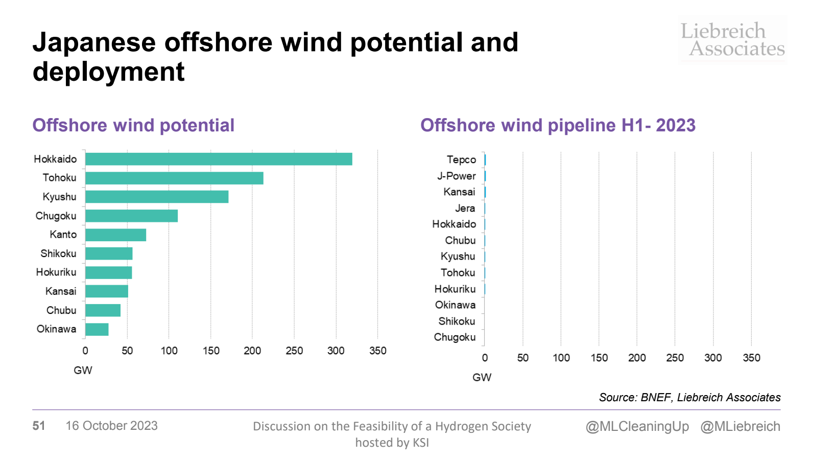 英国では現在、総発電容量14GWの洋上風力設備があり、2030年までに50GWを目指す計画です。対して日本は、経済規模が2倍大きいにもかかわらず、目標は10GWです。日本の会社に資金やスキルがないわけではないのです。(講演会の)数日前、丸紅が英国の洋上風力発電事業へ100億ポンドを投資すると発表しました。なぜ日本ではなくて英国なのでしょうか?日本に水素戦略はありますが、本格的な洋上風力戦略は存在しないからです。(リーブライク氏)