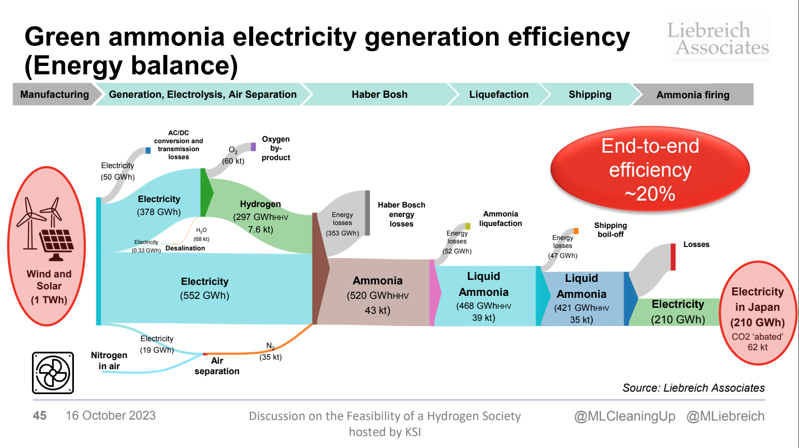 日本へグリーンアンモニアを輸入する場合、再生可能エネルギー由来の電力からアンモニアを合成・液化し、輸送して、(混焼・専焼発電により)電力に戻してエンドユーザーが使うまでの生産地から需要地までの間に、エネルギーが5分の1になってしまいます。すると、必然的に日本での電気の価格は生産地に比べて5倍になります。各経由地での資本コストやメンテナンスの費用も考慮すれば、7〜10倍の費用がかかる可能性があります。他国より7〜10倍も高い電力で、経済競争力があると言えるでしょうか?(リーブライク氏)