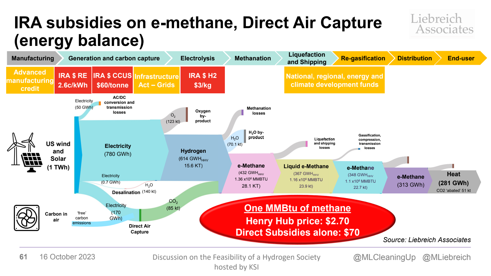 アメリカで製造するのは、同国が2022年に成立させたインフレ抑制法(Inflation Reduction Act)がクリーンエネルギー事業に多額の補助金を提供するためです。合成メタンの場合、様々な補助金が重なり最終的に1MMBtu当たり70米ドルの補助金を受け取ることになります。米国市場で天然ガスがおよそ2.7米ドルで取引されているのに、多額の補助金を受けて効率の悪いエネルギーを輸入することは合理的と言えるのか、とリーブライク氏は問いかけます。