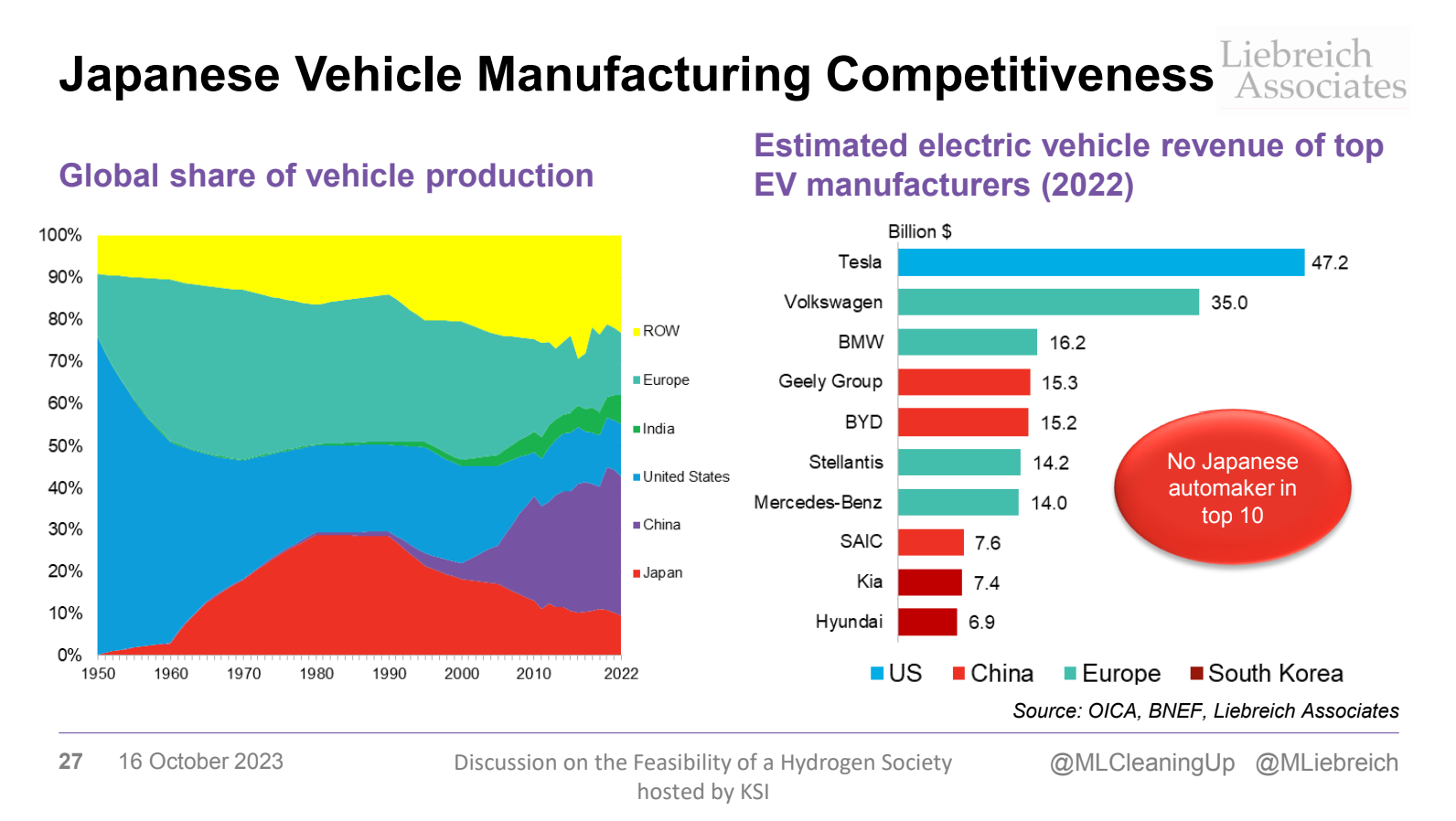 日本の自動車メーカーの競争力:左図は自動車製造の国・地域別シェア、右図は自動車メーカーのEV販売収益ランキング(2022年予測)© Liebreich Associates