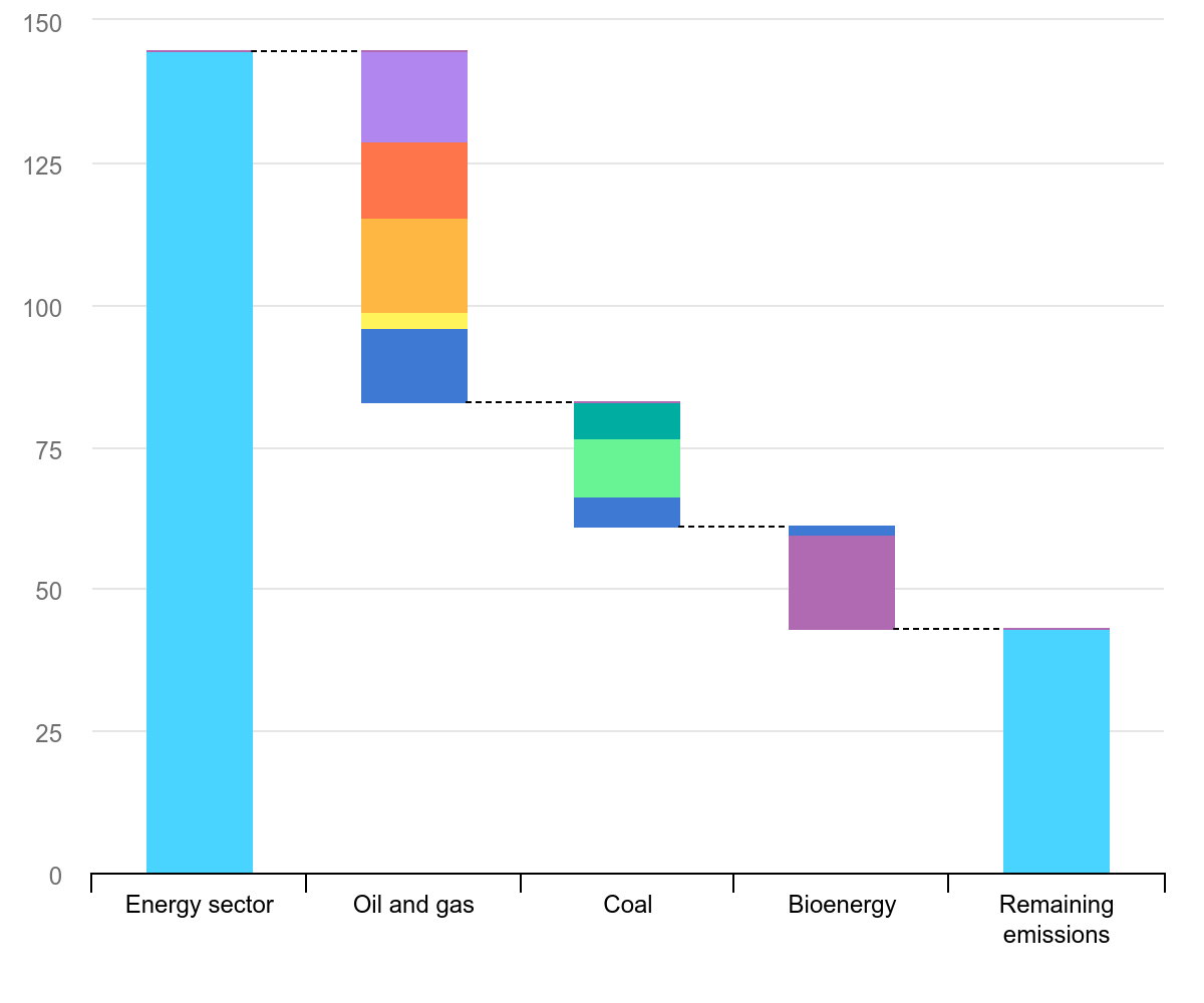 石油・ガス、石炭採掘に関わるエネルギー産業が4割近く排出。その7割は既存の技術で削減可能。