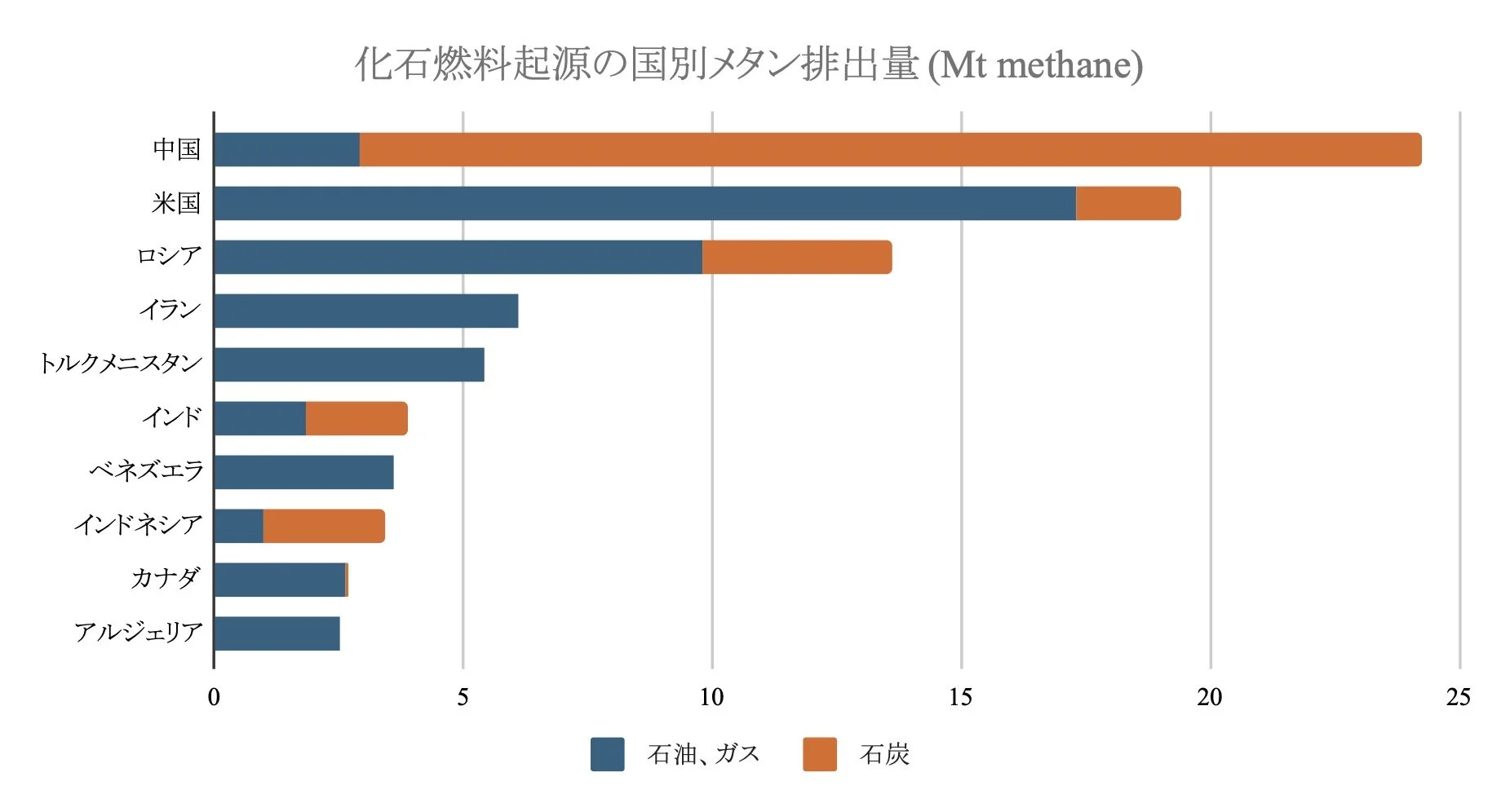 国別の排出量では、中国が最も多く、それに次いで米国、ロシアと続く。中国では石炭からの排出が多いのに対し、米国では石油・ガスからの排出が多い。石油・ガスからの排出に注目すると、米国が世界で最も多い。