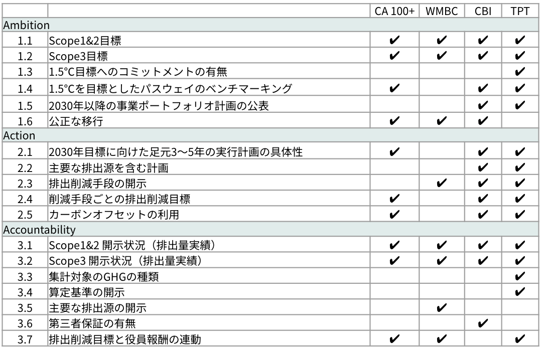 表1は、Climate Action 100+、We Mean Business Coalition、Climate Bonds Initiative(CBI)、Transition Plan Taskforce (TPT)(*2)などの代表的なガイダンスを参照し、鎌倉サステナビリティ研究所(KSI.)で重要な項目をまとめたものである。TPT等のガイダンスに習い、ネットゼロに向けた⽬標設定(Ambition)、⽬標達成のための計画(Action)、排出量等の実績(Accoundability)の3つの視点で整理している。