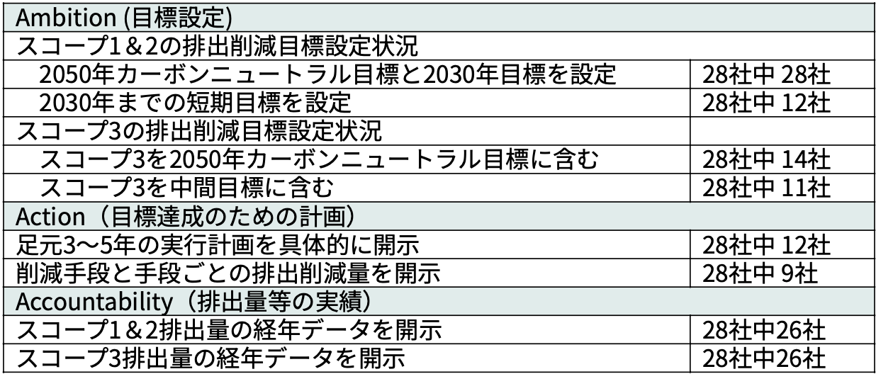 次に、排出削減目標を達成するための実行計画の策定状況について見てみると、2030年目標に向けた足元3~5年の実行計画を開示しているのは28社中12社、さらに、目標を達成するための具体的な削減手段と手段ごとの排出削減量を開示している企業は9社であった。